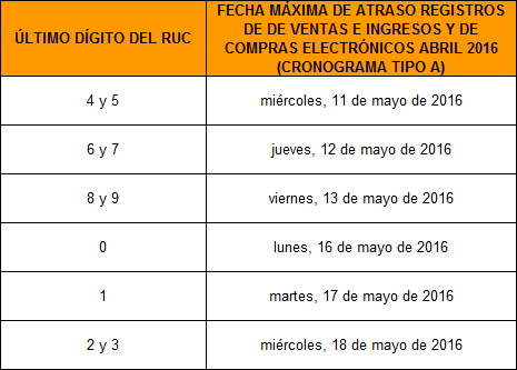 A partir del día de hoy miércoles 11/05/2016 se inician los vencimientos de las fechas máximas de atraso del Registro de Ventas e Ingresos y Registro de Compras llevados de manera electrónica mediante el Sistema de Libros Electrónicos – PLE, correspondientes al mes de Abril 2016 del Cronograma Tipo A del Anexo Nº 3 aprobado por la Res. de Superintendencia Nº 360-2015/SUNAT.