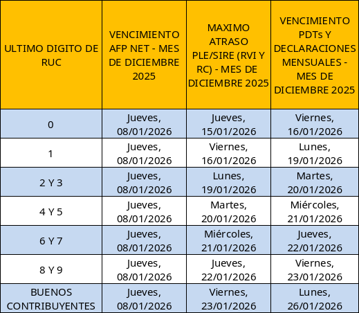 El jueves 08/01/2026, comienzan a vencer las obligaciones mensuales correspondientes al mes de diciembre del 2025 comenzando con la obligación de presentar las planillas de las AFP en el portal AFP Net, según los siguientes cronogramas: