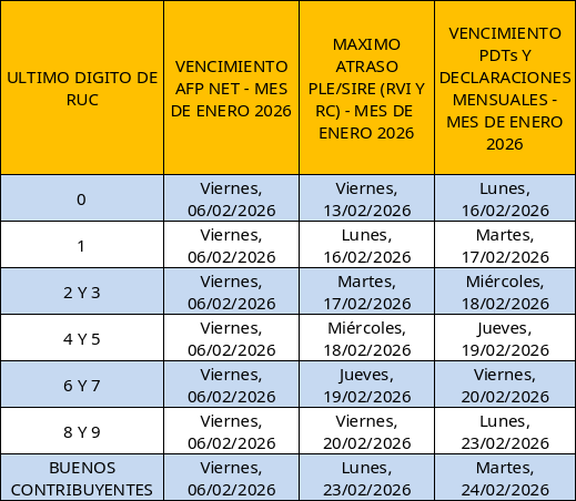 El viernes 06/02/2026, comienzan a vencer las obligaciones mensuales correspondientes al mes de enero del 2026 comenzando con la obligación de presentar las planillas de las AFP en el portal AFP Net, según los siguientes cronogramas: